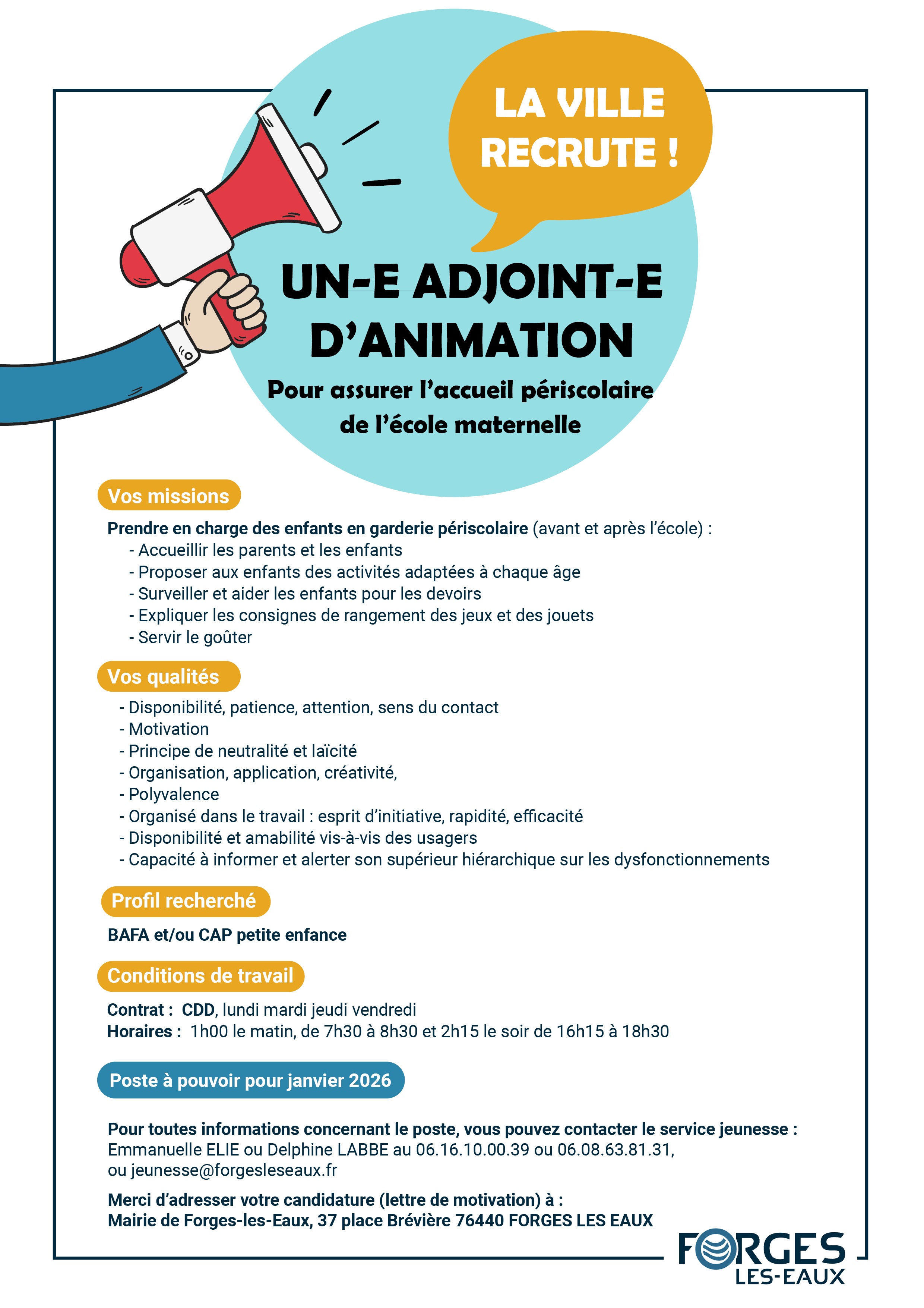 Merci d'adresser votre candidature (lettre de motivation) à : Mairie de Forges les Eaux, 37 Place Brévière, 76440 Forges les Eaux