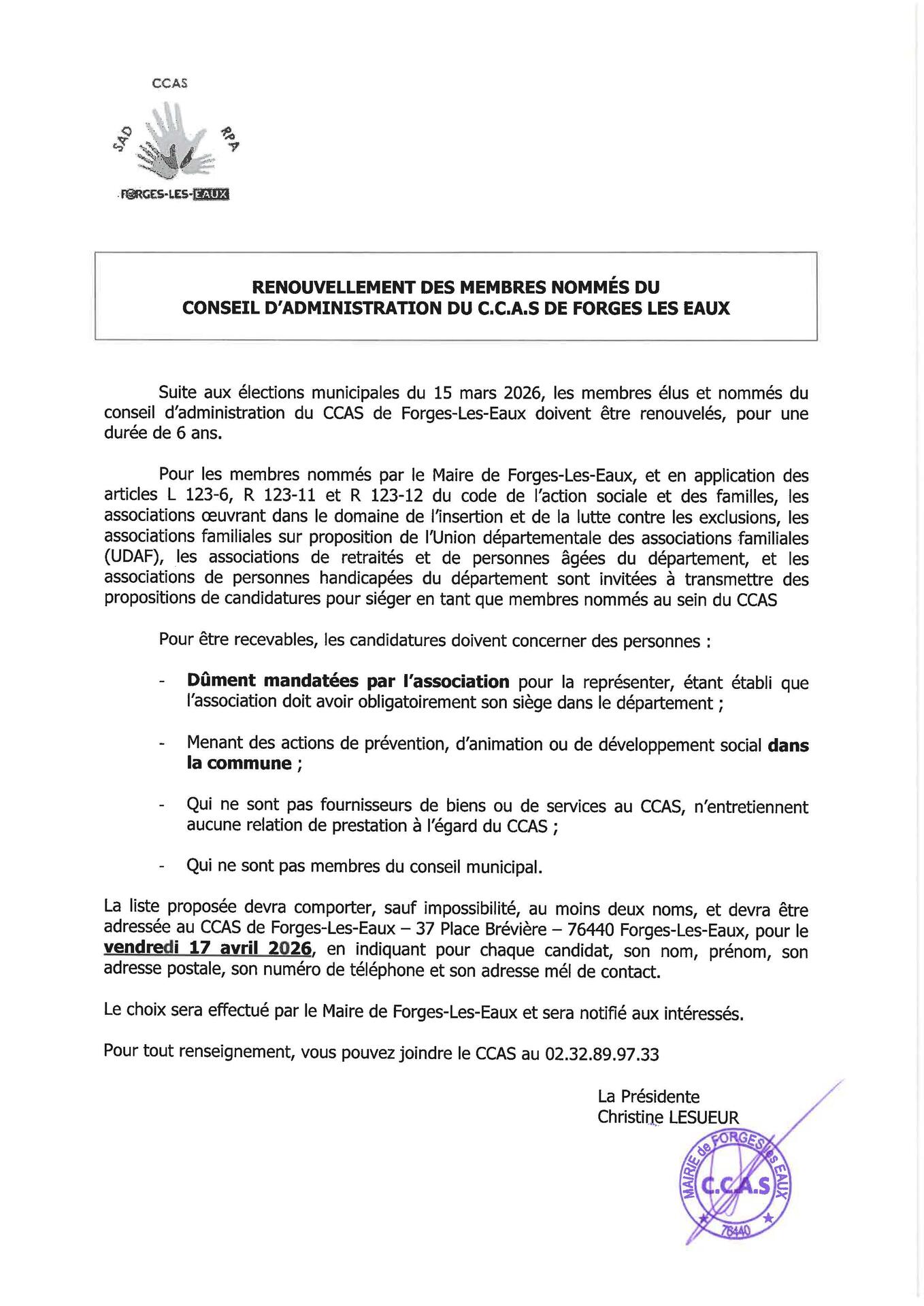 Suite aux élections municipales, les membres élus et nommés du conseil d'administration du CCAS de Forges-les-Eaux doivent être renouvelés.